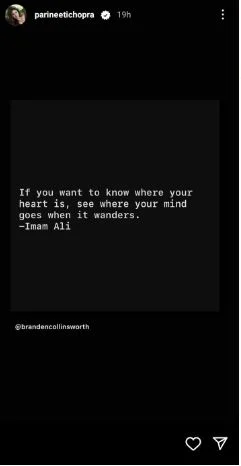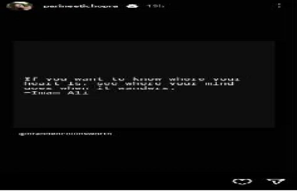 پرینیتی چوپڑا نے اپنی انسٹا اسٹوری پر ایک پوسٹ شیئر کی ہے جس میں خلافتِ راشدہ کے چوتھے اور آخری خلیفہ حضرت علی ؓ کا ایک قول تحریر کیا ہے۔