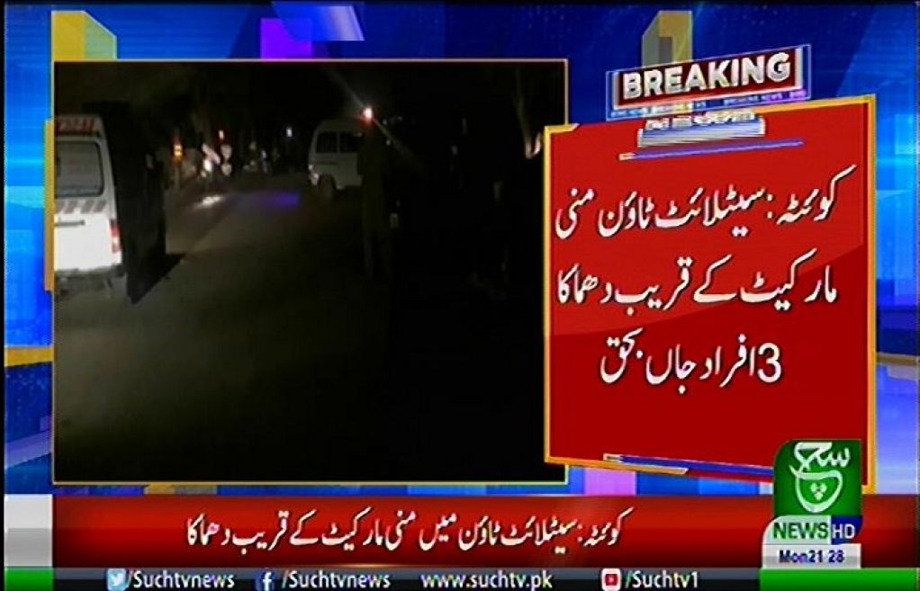 کوئٹہ مین سیٹلائٹ ٹاؤن منی مارکیٹ کے قریب دھماکا ہوا جس کے نتیجے میں 3 افراد جاں بحق جبکہ متعد افراد زخمی ہو گئے ہیں۔