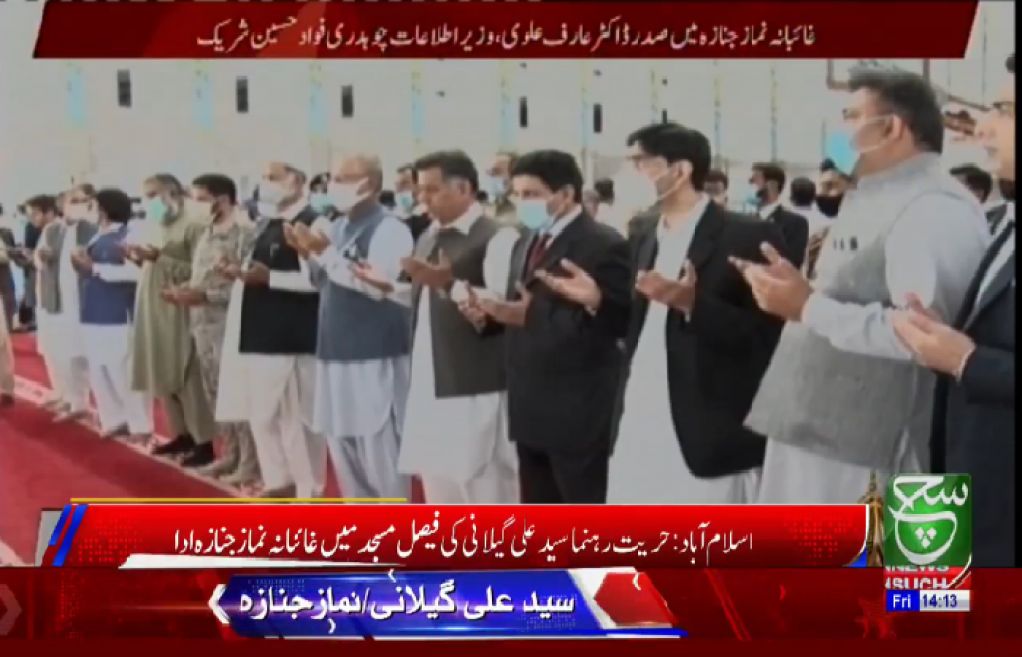 حریت رہنما سید علی گیلانی کی غائبانہ نماز جنازہ فیصل مسجد میں ادا کر دی گئی ہے۔فیصل مسجد کی نماز جنازہ میں صدر مملکت عارف علوی، ڈی جی آئی ایس آئی لیفٹیننٹ جنرل فیض حمید، وفاقی وزیرفواد چوہدری، مشیرقومی سلامتی معید یوسف اوروزیراعظم آزاد کشمیرسردارعبدالقیوم نیازی نے شرکت کی۔