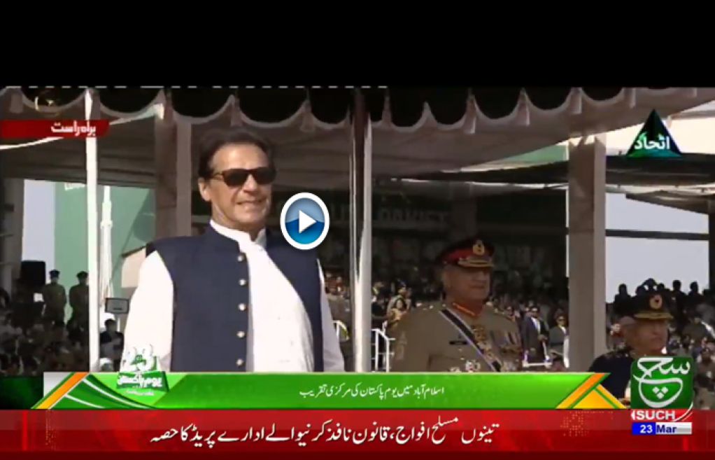 وفاقی دارالحکومت اسلام آباد میں یوم پاکستان کی مرکزی پریڈ جاری ہے۔ اسلام آباد کے شکر پڑیاں پریڈ گراؤنڈ یوم پاکستان کی مرکزی تقریب جاری ہے جس میں مسلح افواج کے آرمڈ کور، ائیر ڈیفنس اور دیگر دستے مارچ پریڈ و فلائی پاسٹ کا مظاہرہ کریں گے، اس کے علاوہ میزائل، یو اے وی پاکستان کے ناقابل تسخیردفاع کی علامت کے طور پر پریڈ کا حصہ ہیں۔