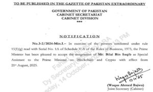 پاکستان کے وزیرِ دولت برائے کرپٹو اور بلاک چین، بلال بن ثاقب نے قواعد و ضوابط کی پابندی کے لیے وزیراعظم کے خصوصی معاون (SAPM) کے عہدے سے استعفیٰ دے دیا ہے۔