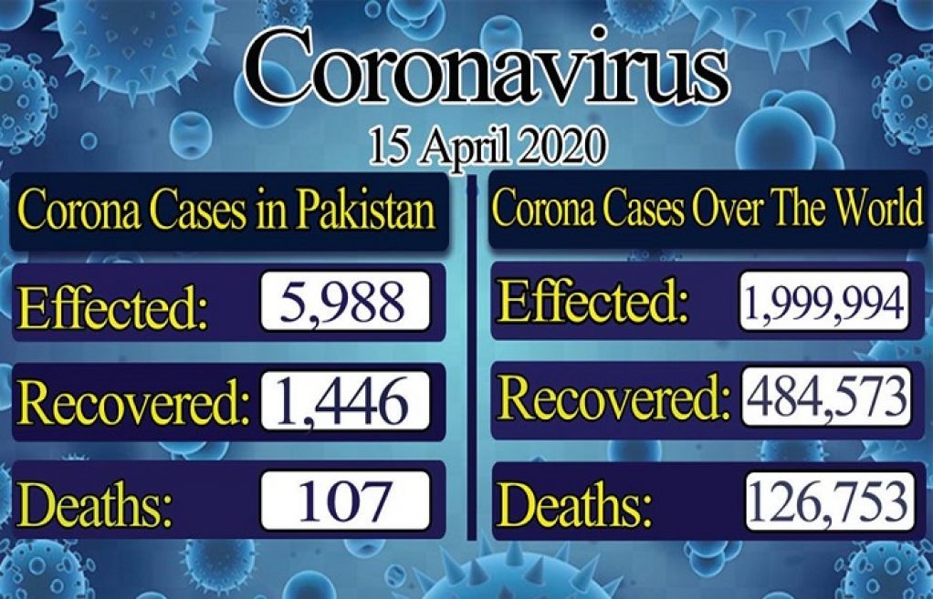 پاکستان میں آج کورونا وائرس سے اب تک اموات کی مجموعی تعداد 107 ہوگئی جب کہ نئے کیسز سامنے آنے کے بعد متاثرہ مریضوں کی تعداد 5,988 تک پہنچ گئی۔
