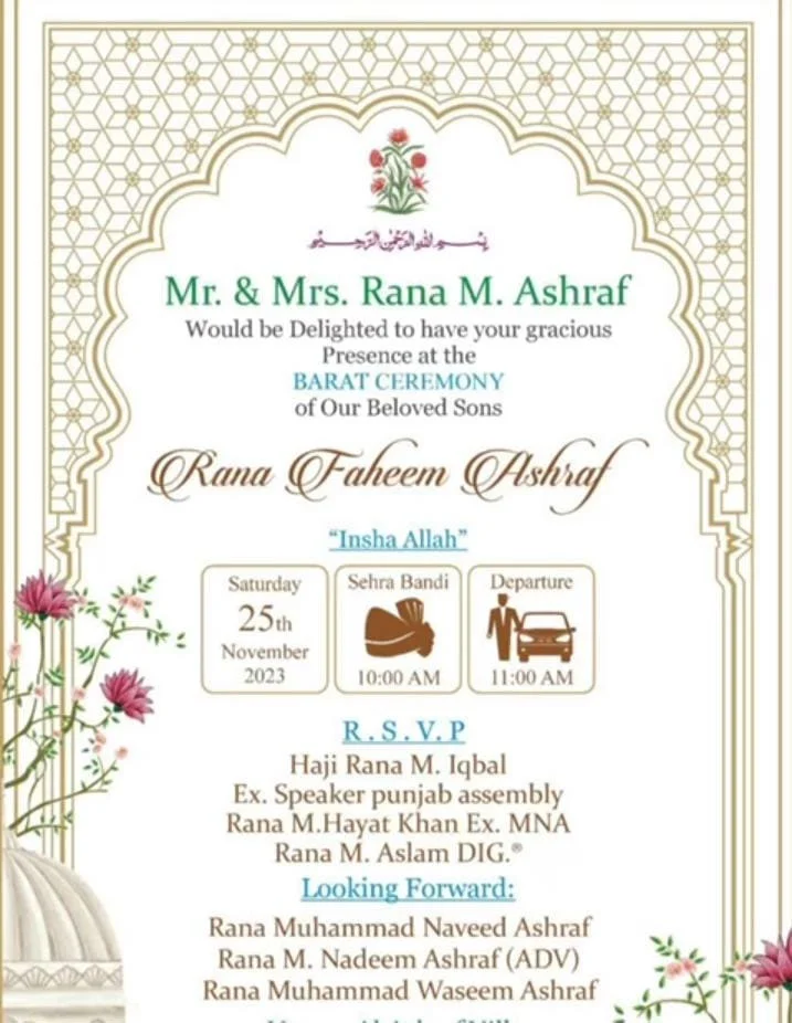 ذرائع کا کہنا ہے کہ فہیم اشرف کی مہندی 23 نومبر، بارات 25 اور ولیمہ 26 نومبر کو ہوگا، شادی کی تقریب نارووال جب کہ ولیمہ کی تقریب پھول نگر میں ہوگی۔
