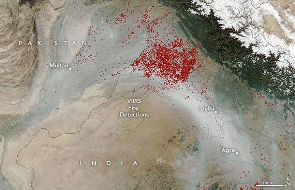 ناسا نے تصویر جاری کرتے ہوئے لکھا کہ ’بھارت کے شمالی علاقوں میں لگی آگ کے دھوئیں نے دہلی کو لپیٹ میں لے لیا ہے۔